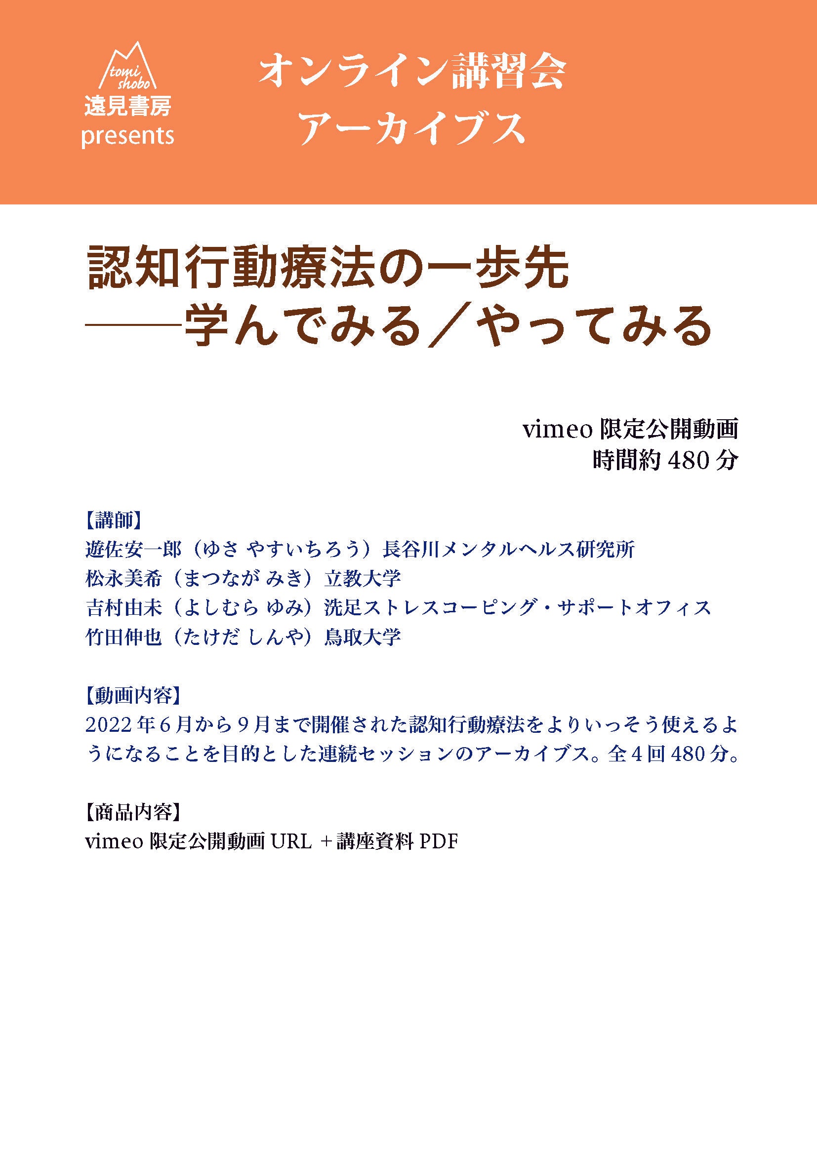 オンライン講習会 アーカイブス(全4回)/「認知行動療法の一歩先 ──学んでみる/やってみる」/遊佐安一郎・松永美希・吉村由未・竹田伸也